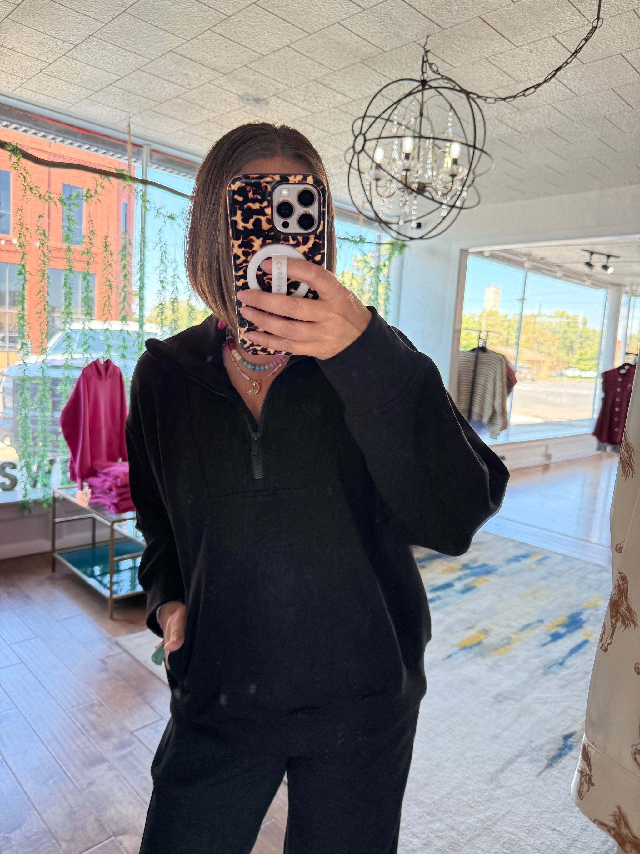 This lounge set is buttery soft with a cooling fabric. The pullover top has a quarter neck zipper at the chest and a kangaroo pocket. The pants are a straight leg with pockets and an elastic waist.