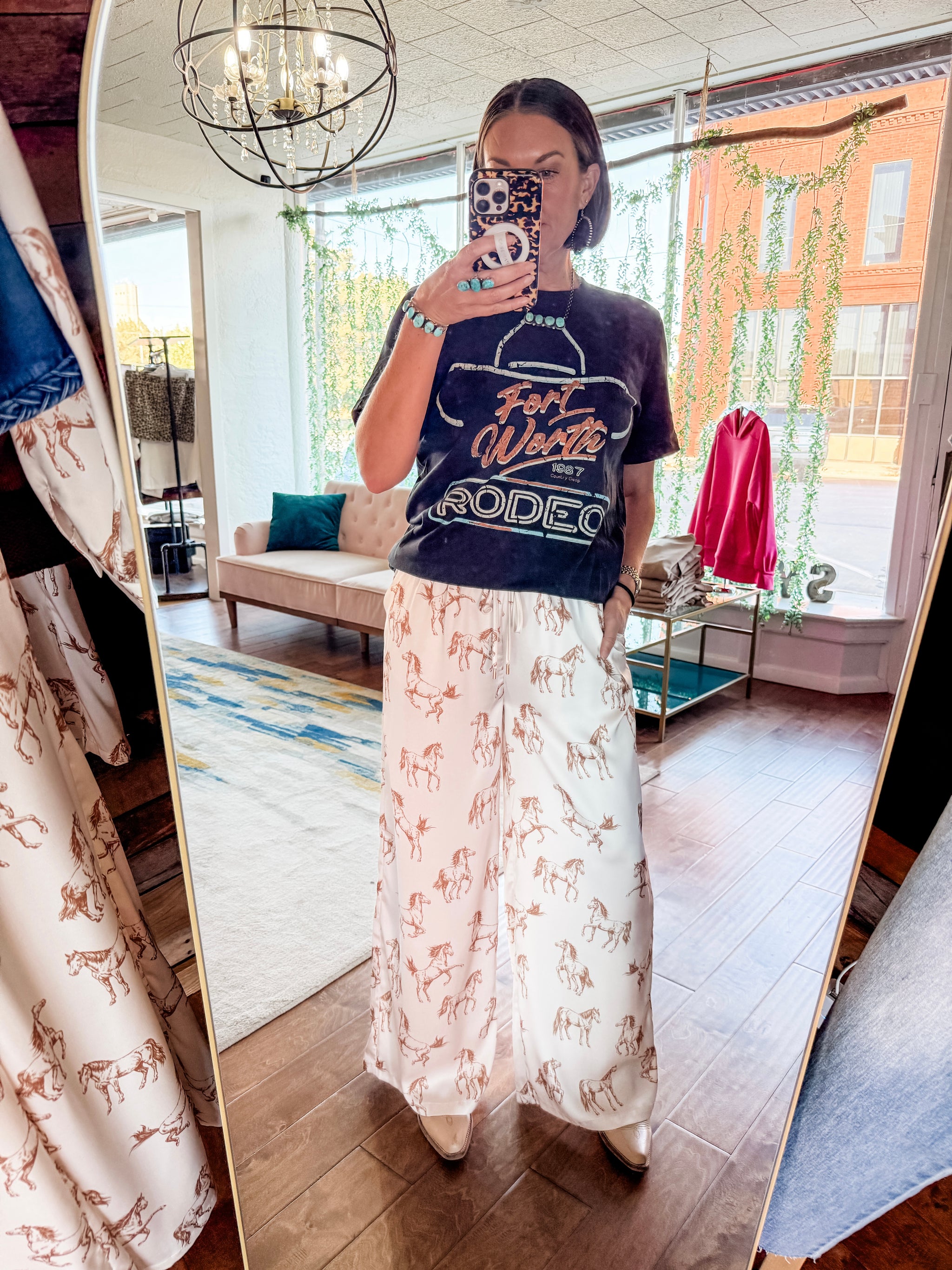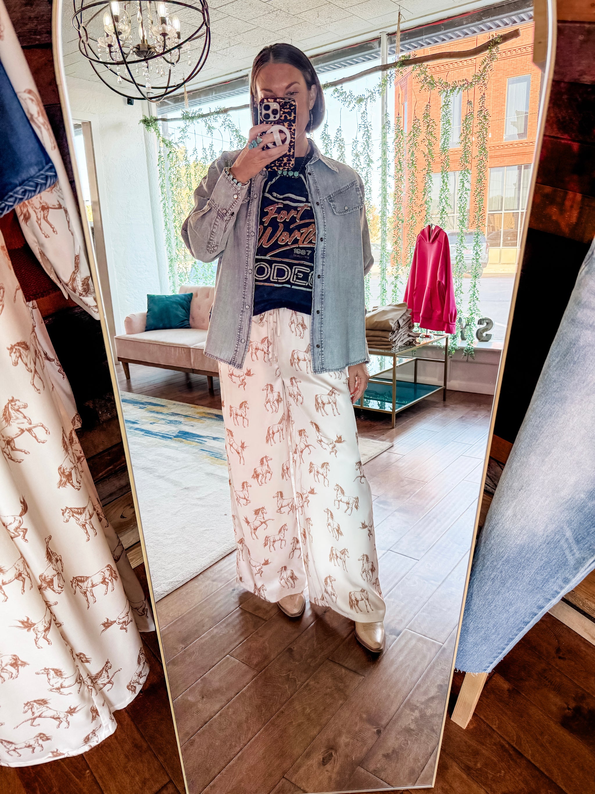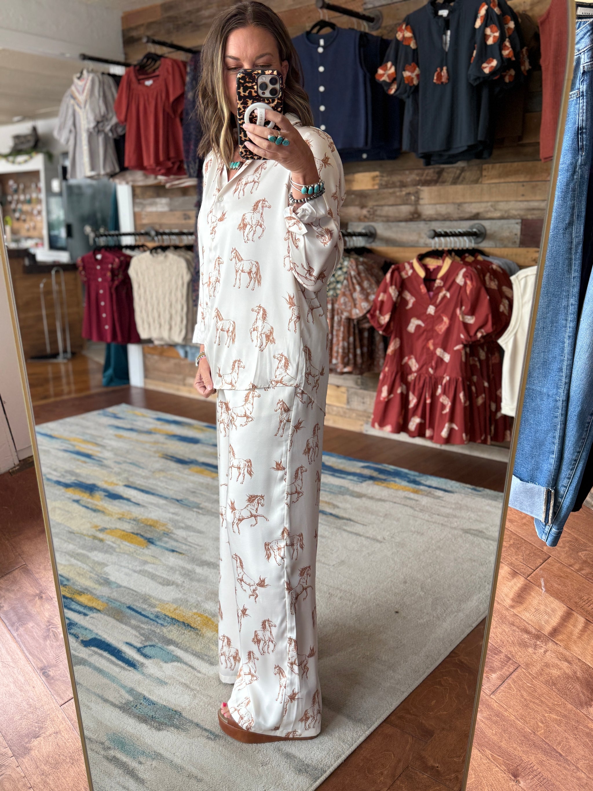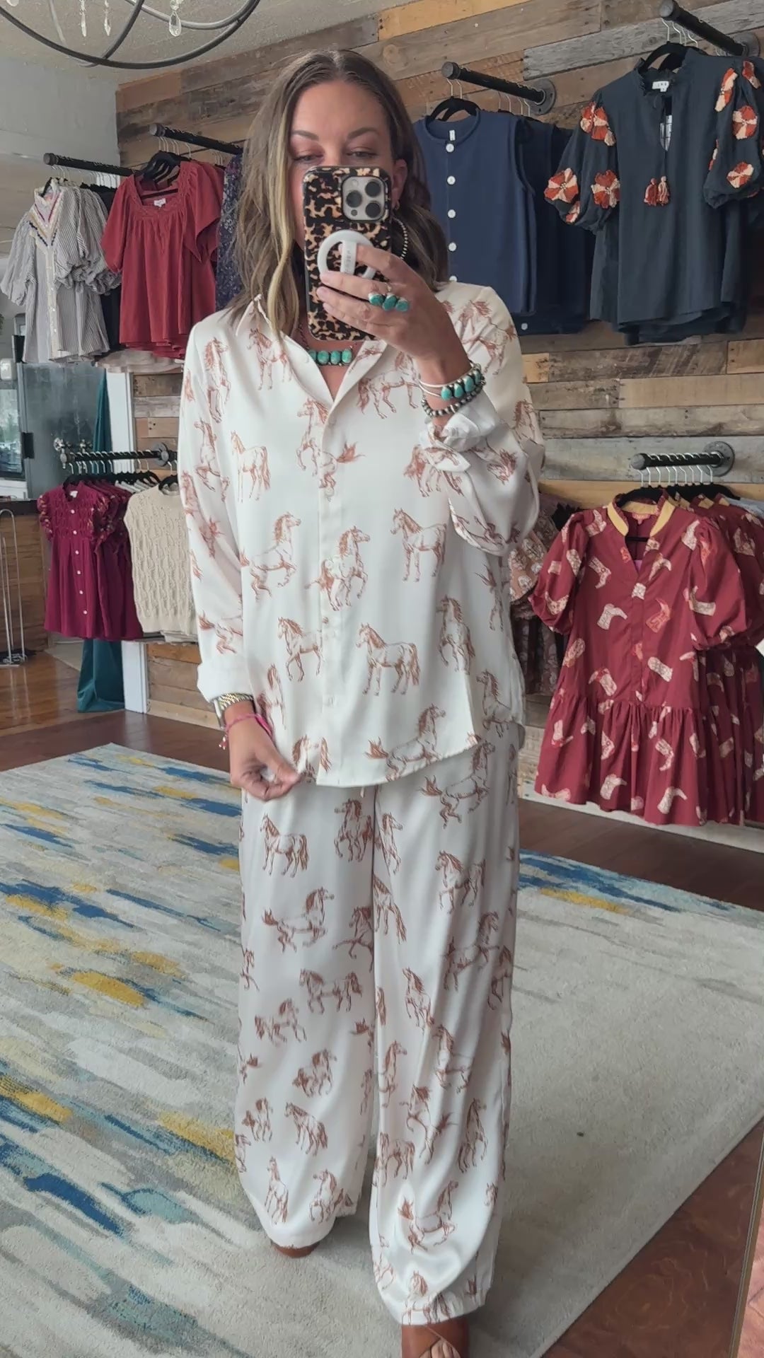 These pants are so beautiful with its cream satin background and camel horse print. Pair with denim or the matching Horse Satin Blouse!