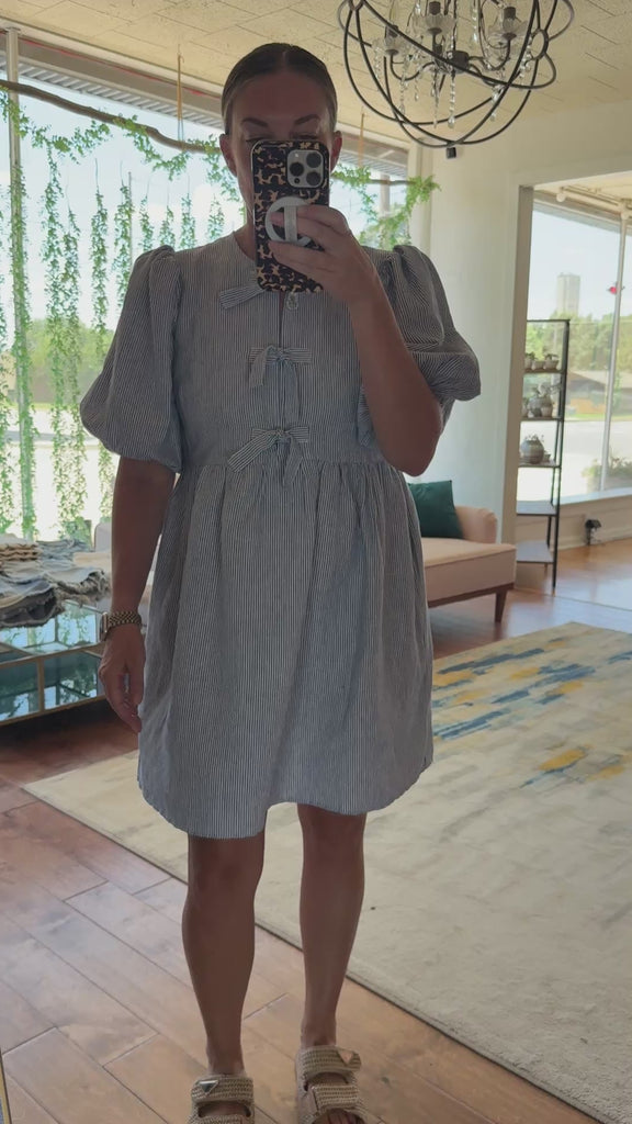 Our Jenny Stripe Dress features a bubble sleeve and a tie closure.
