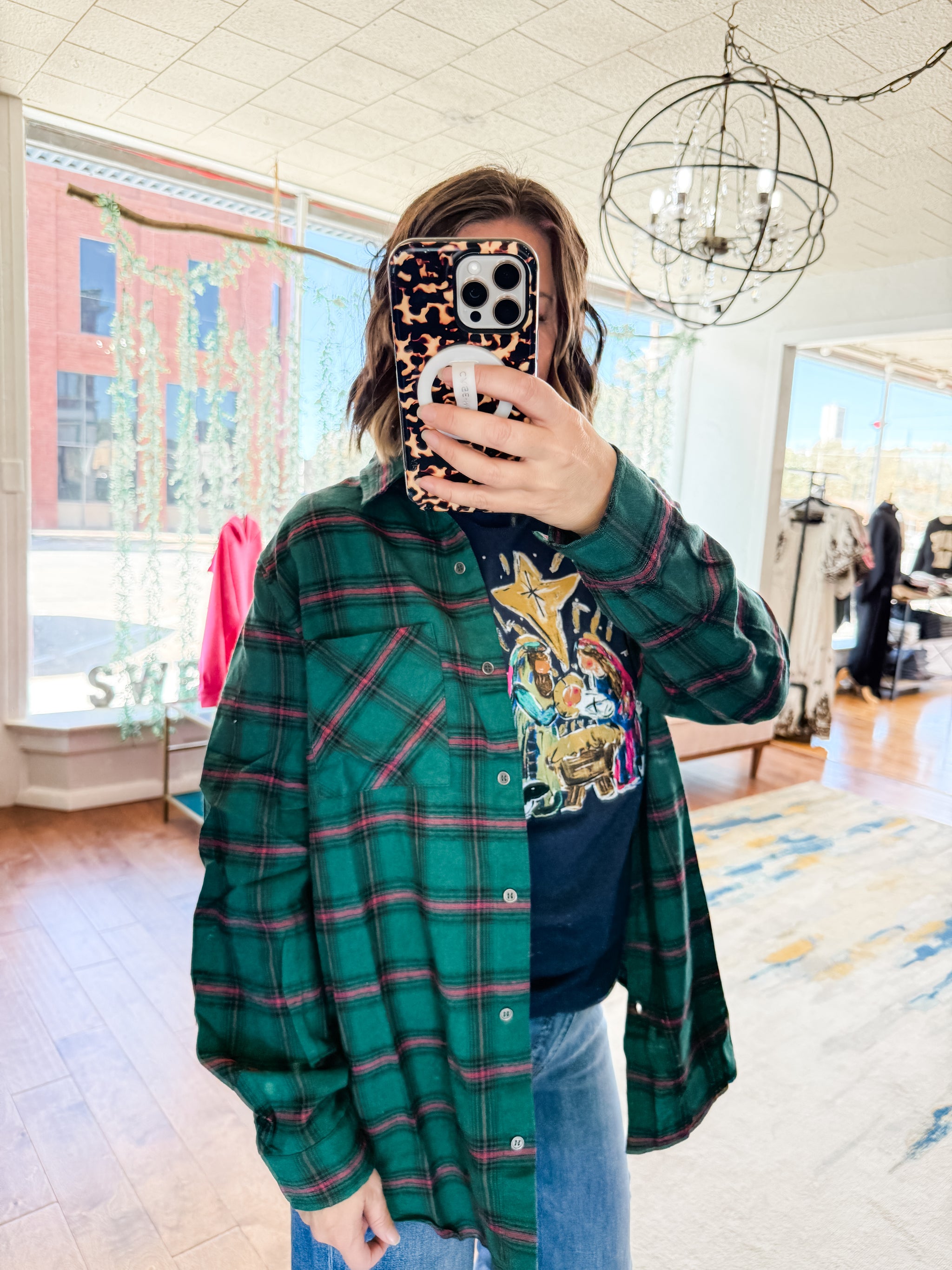 Our classic long-sleeved plaid shirt features the perfect mix of green, red and pink. It has an oversized fit, chest pocket detail with a front button closure. Made to be worn alone or layered over your favorite Christmas tee, this classic button down shirt is forever timeless for a vintage look.