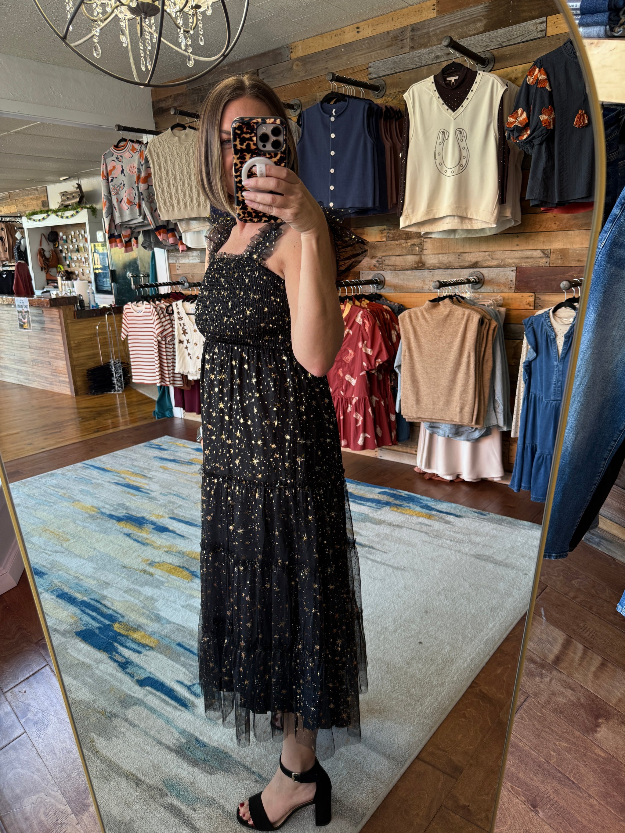 Crafted with a delicate mesh overlay adorned with shimmering gold star accents, this dress offers a dreamy, ethereal vibe.