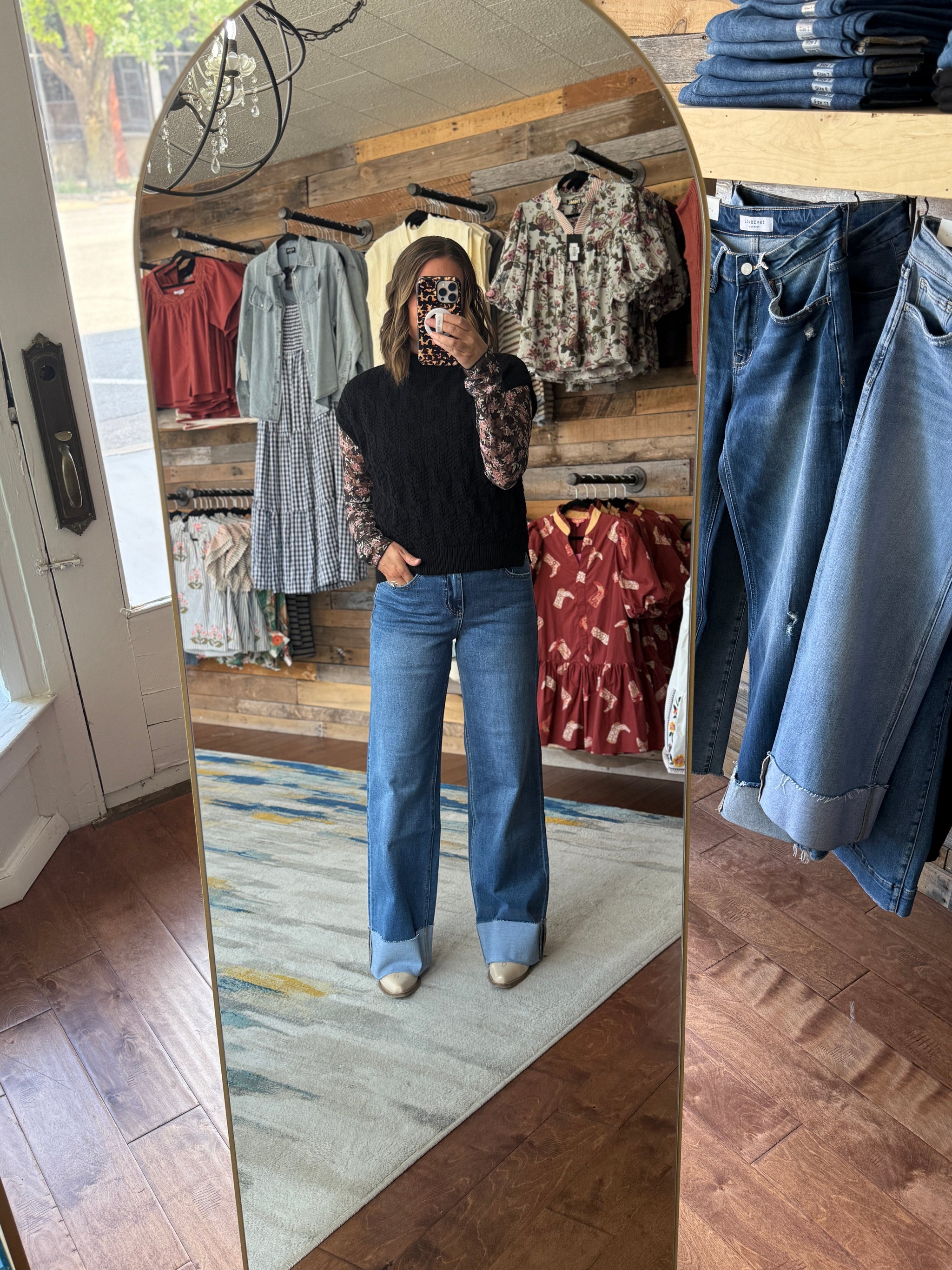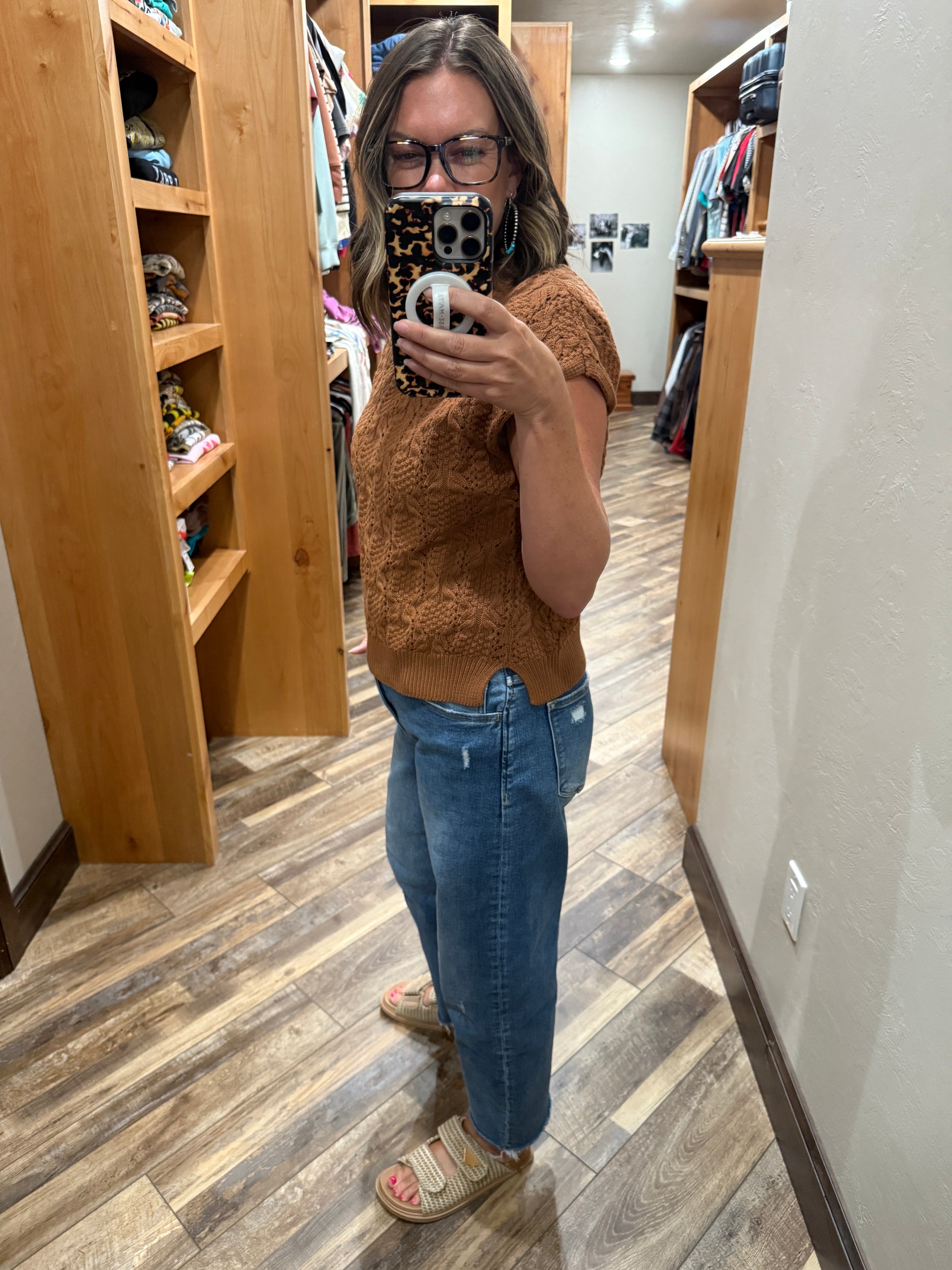 This sweater is the perfect one for early fall days worn by itself, but layer it in the colder months! It has a mock neck and a slight cap sleeve. It is not lined and is slightly see-through.