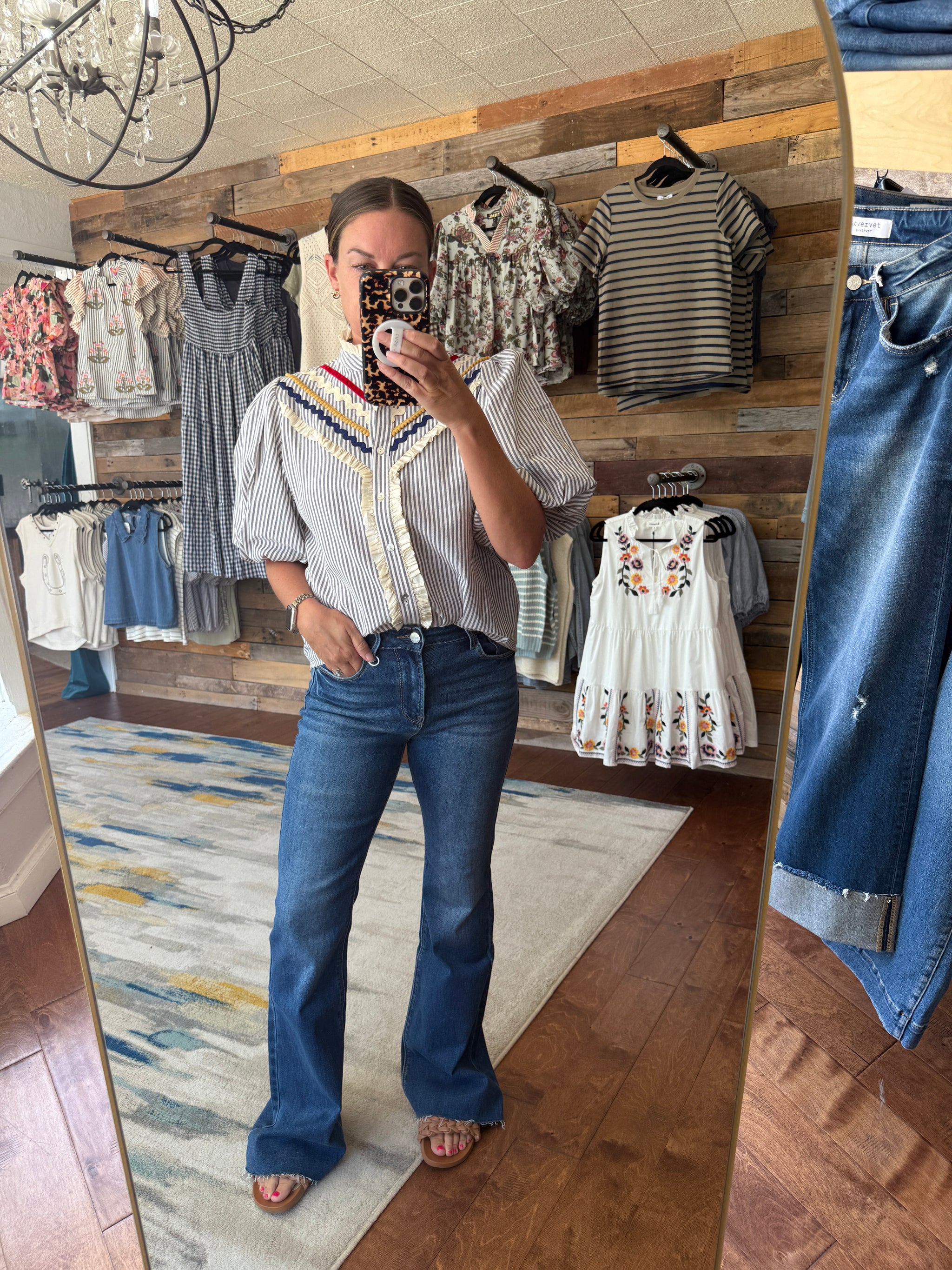This top has a mixture of ribbons and textures around the chest and bodice area. The bubble sleeves and raised collar make this top so unique.