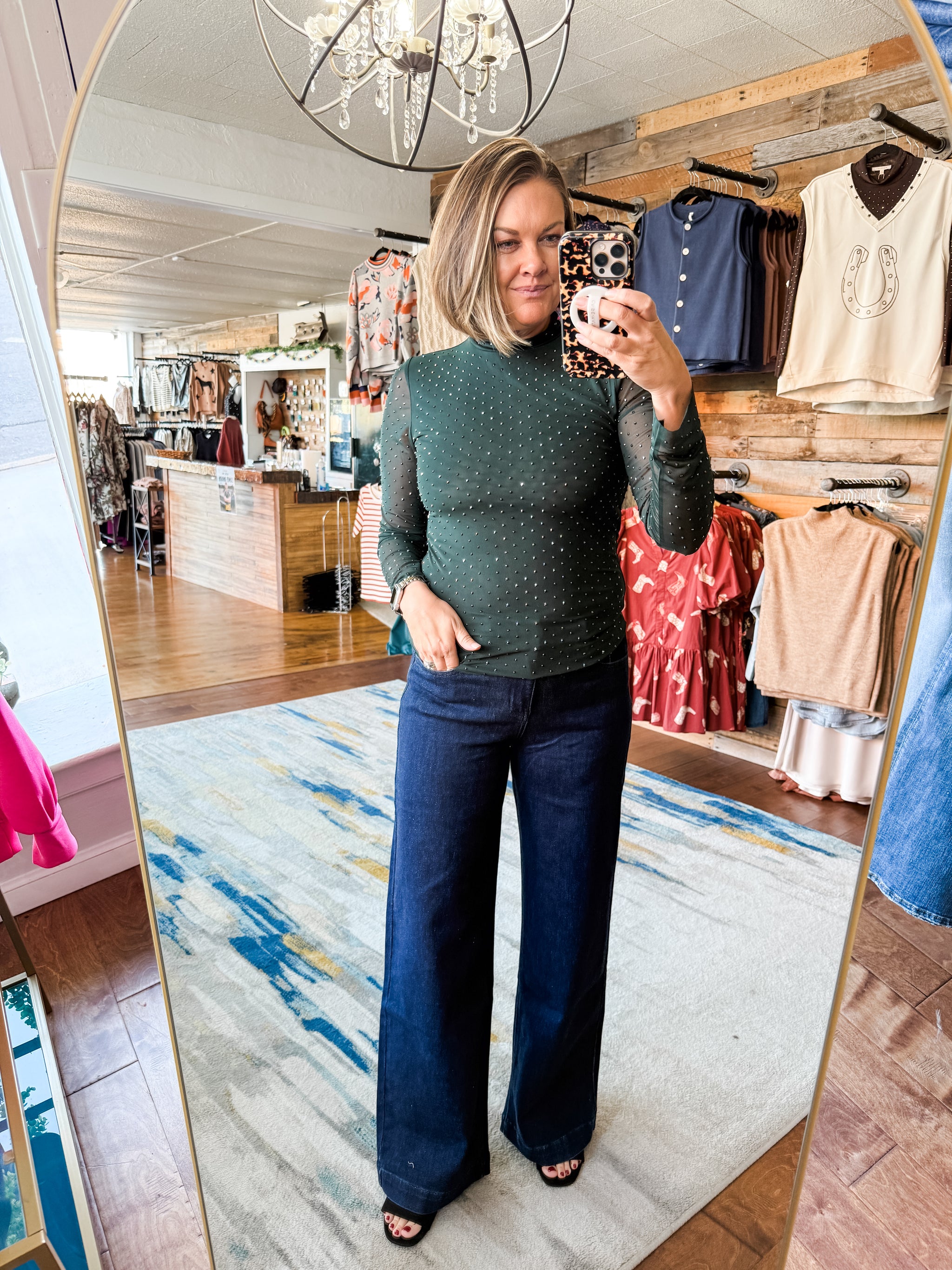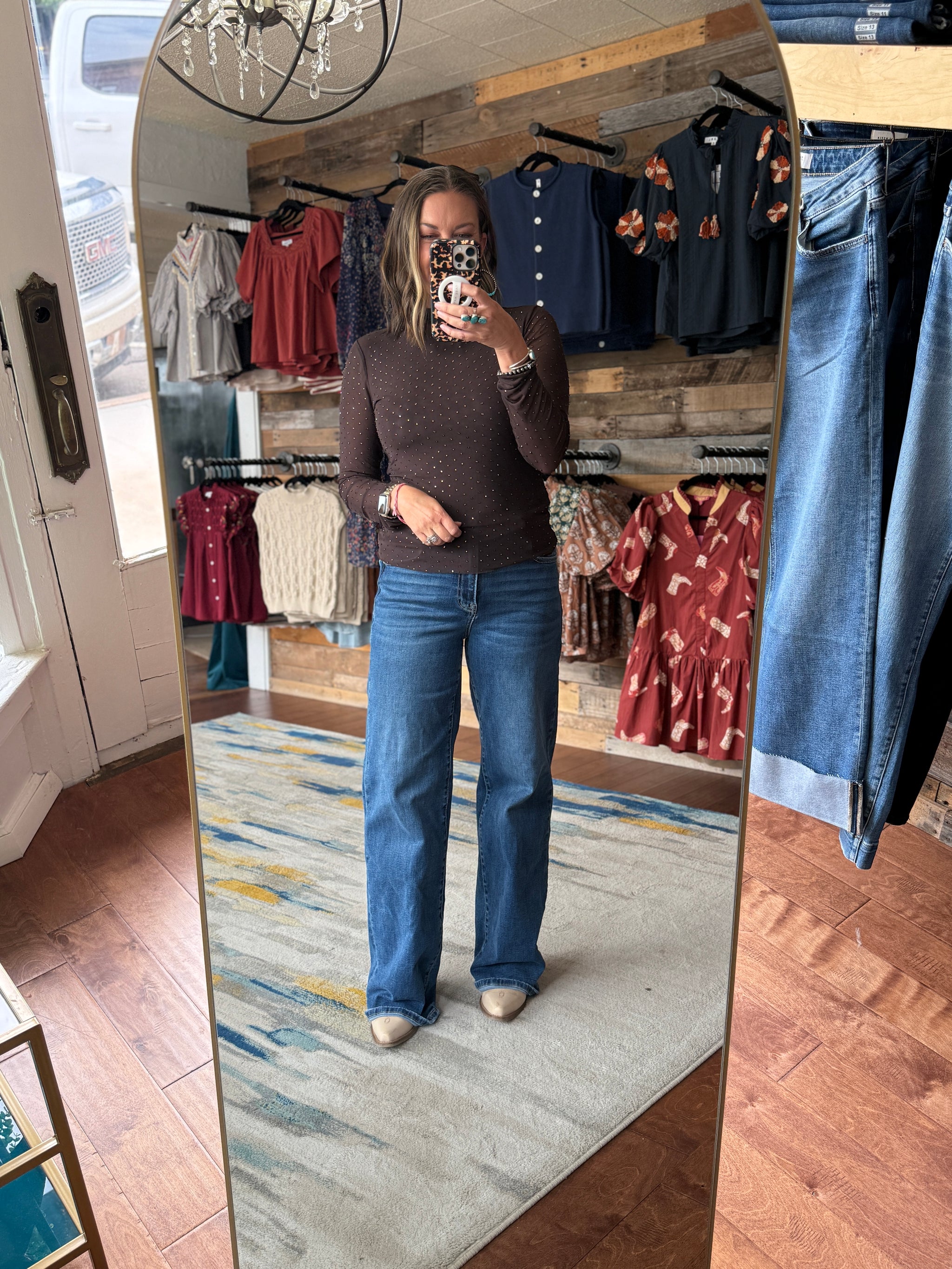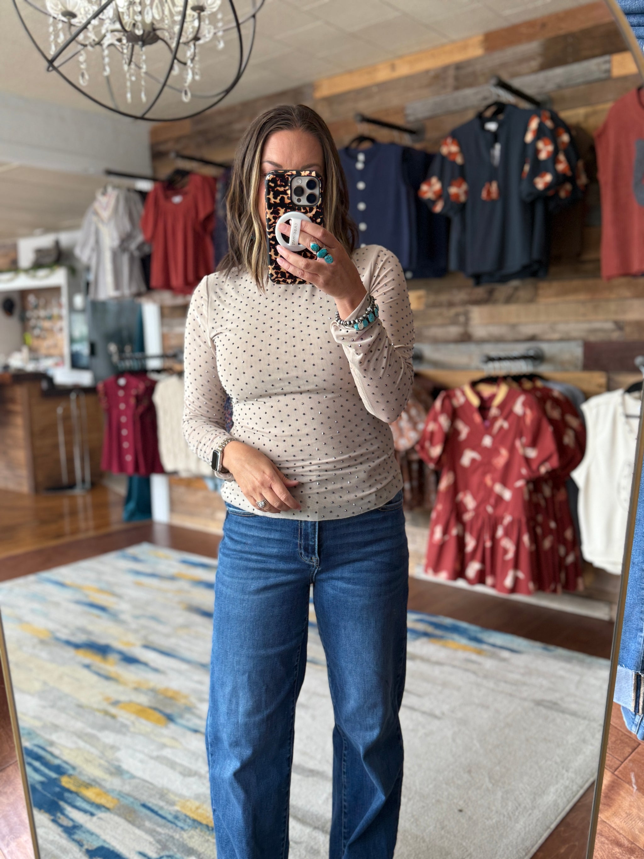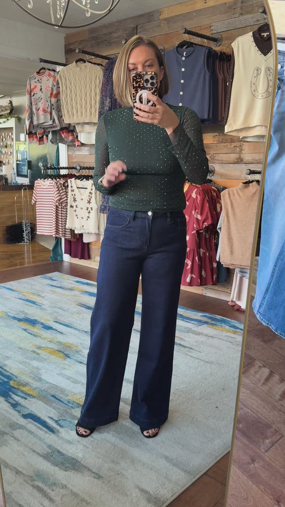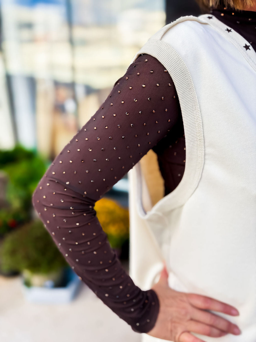 This mesh top is covered in shiny studs to give it an elevated look! The body is lined and the sleeves are see-through. Wear alone or layered under a top.