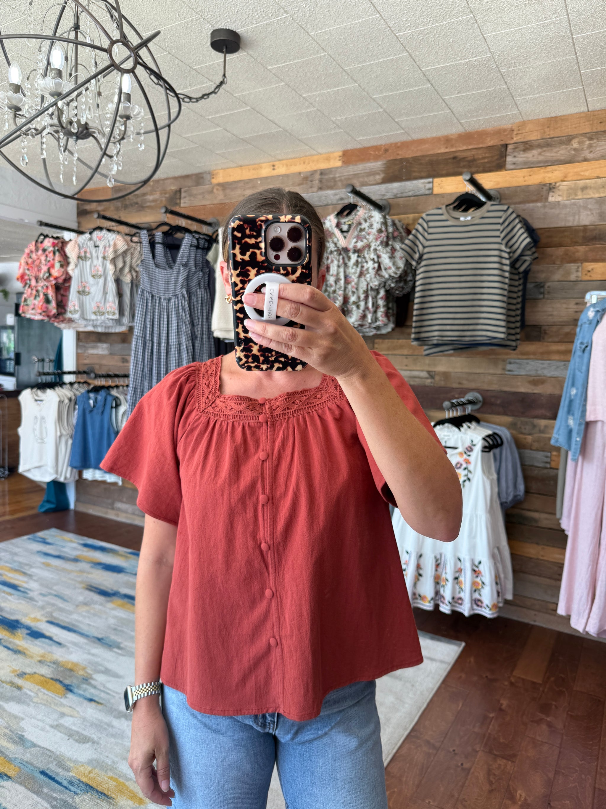 This top is a beautiful rust color that is perfect for fall. The lace details around the square neck make it adorable!
