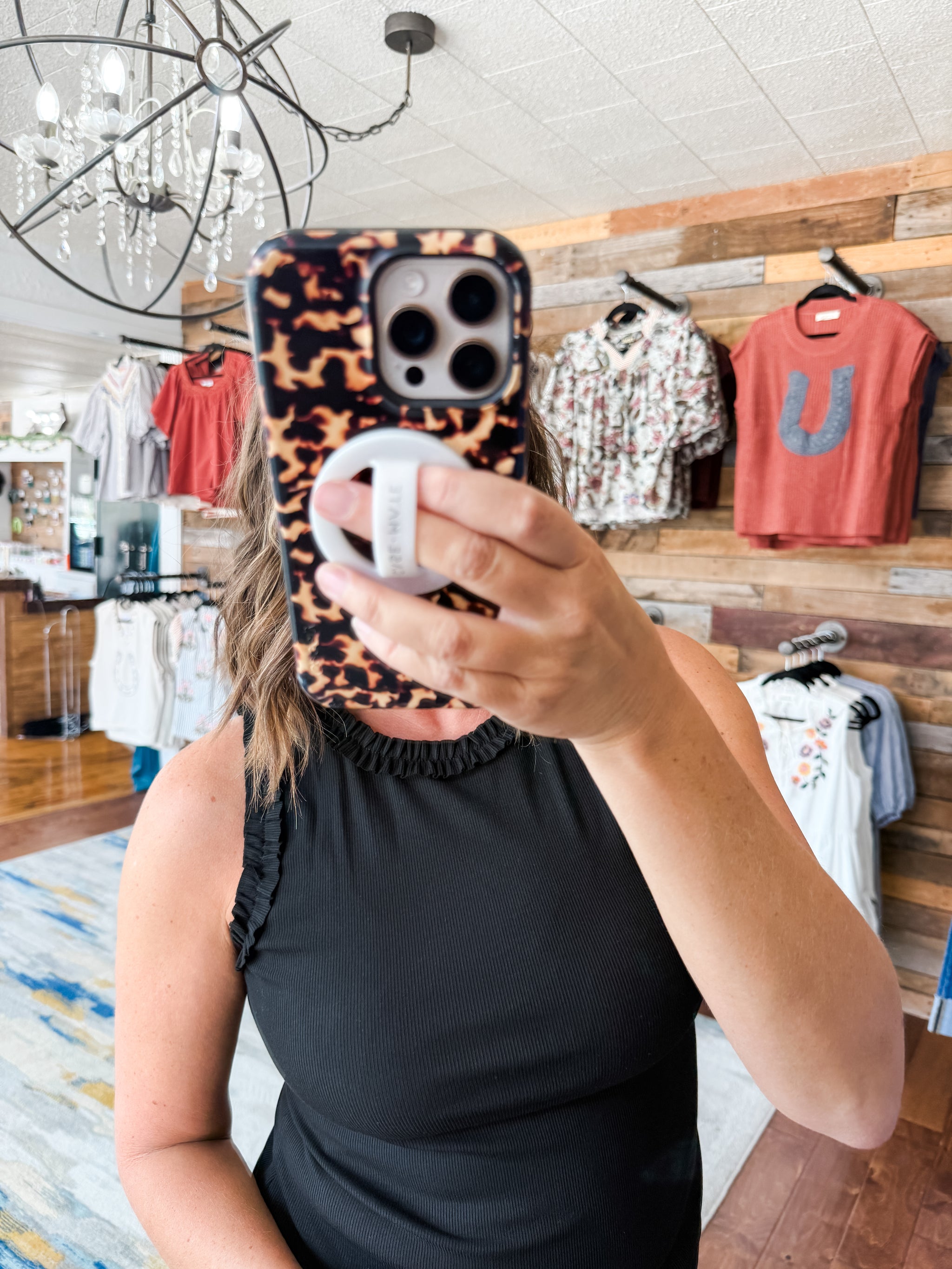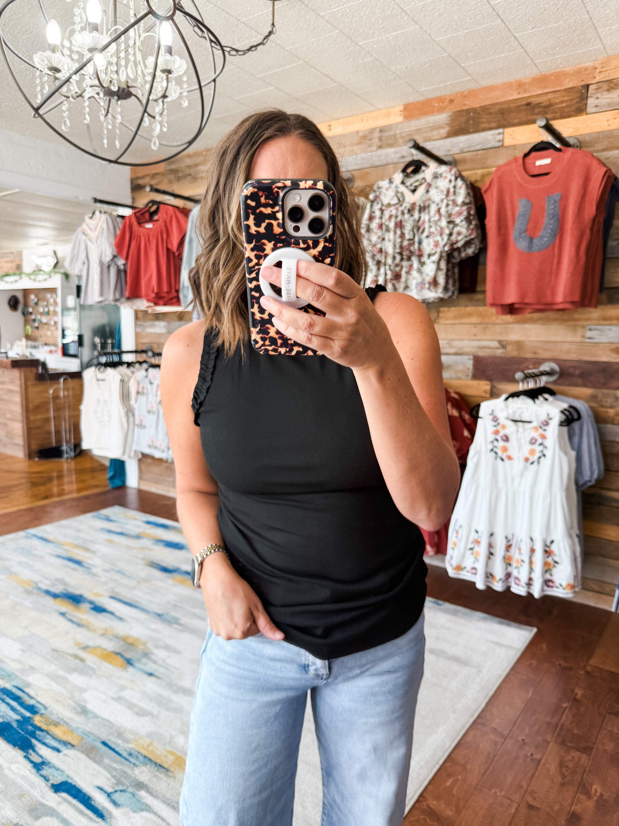 This sleeveless ribbed tank top features playful ruffle trim detailing around the neckline and armholes, adding a flirty touch to your look. With its stretchy, form-fitting design and classic crew neckline, it hugs your shape comfortably while keeping things fun and feminine. Perfect for layering or wearing solo on sunny days!