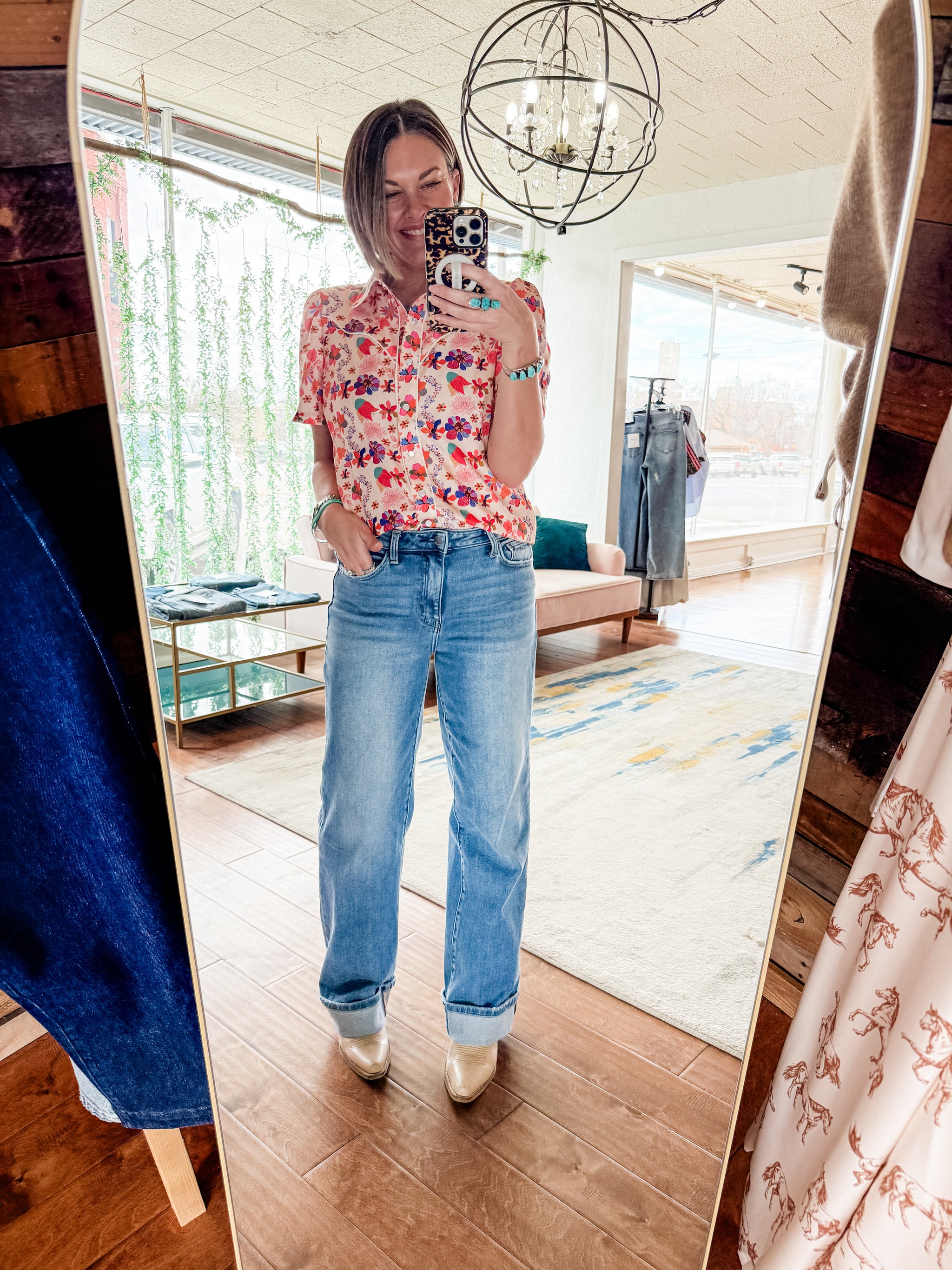 This vintage floral pattern is the prettiest with the brightest colors! It has an old-school western yoke design. on a great satin, pearl snap!