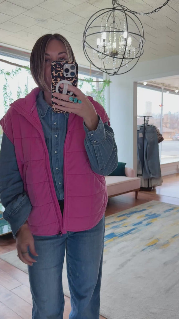 Add a bold pop of color to your cold-weather lineup with the Brightside Quilted Puffer Vest. This vibrant hot-pink layer features a soft, lightly padded quilted design that brings warmth without bulk. The high stand collar and relaxed fit make it perfect for pairing over chunky knits or classic denim shirts. Finished with roomy side pockets and a smooth zip-front closure, it’s an easy throw-on piece that instantly elevates casual looks while keeping you cozy and comfortable.
