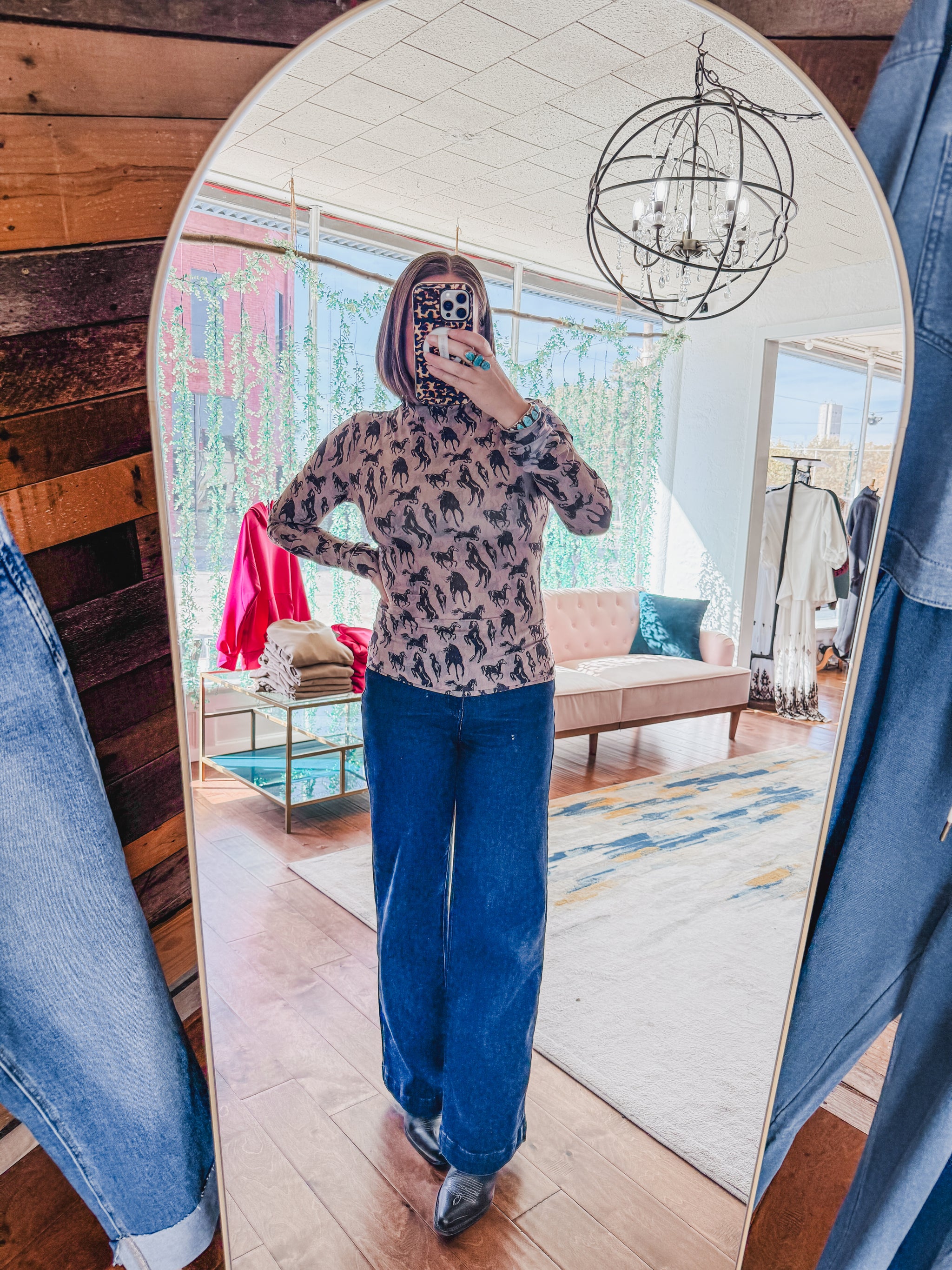This mesh top showcases a playful western horse graphic print, a mock neckline, long fitted sleeves with thumbhole cuffs, and a figure hugging silhouette for a bold, modern cowgirl inspired look. Wear alone or under your favorite graphic tee or sweater.