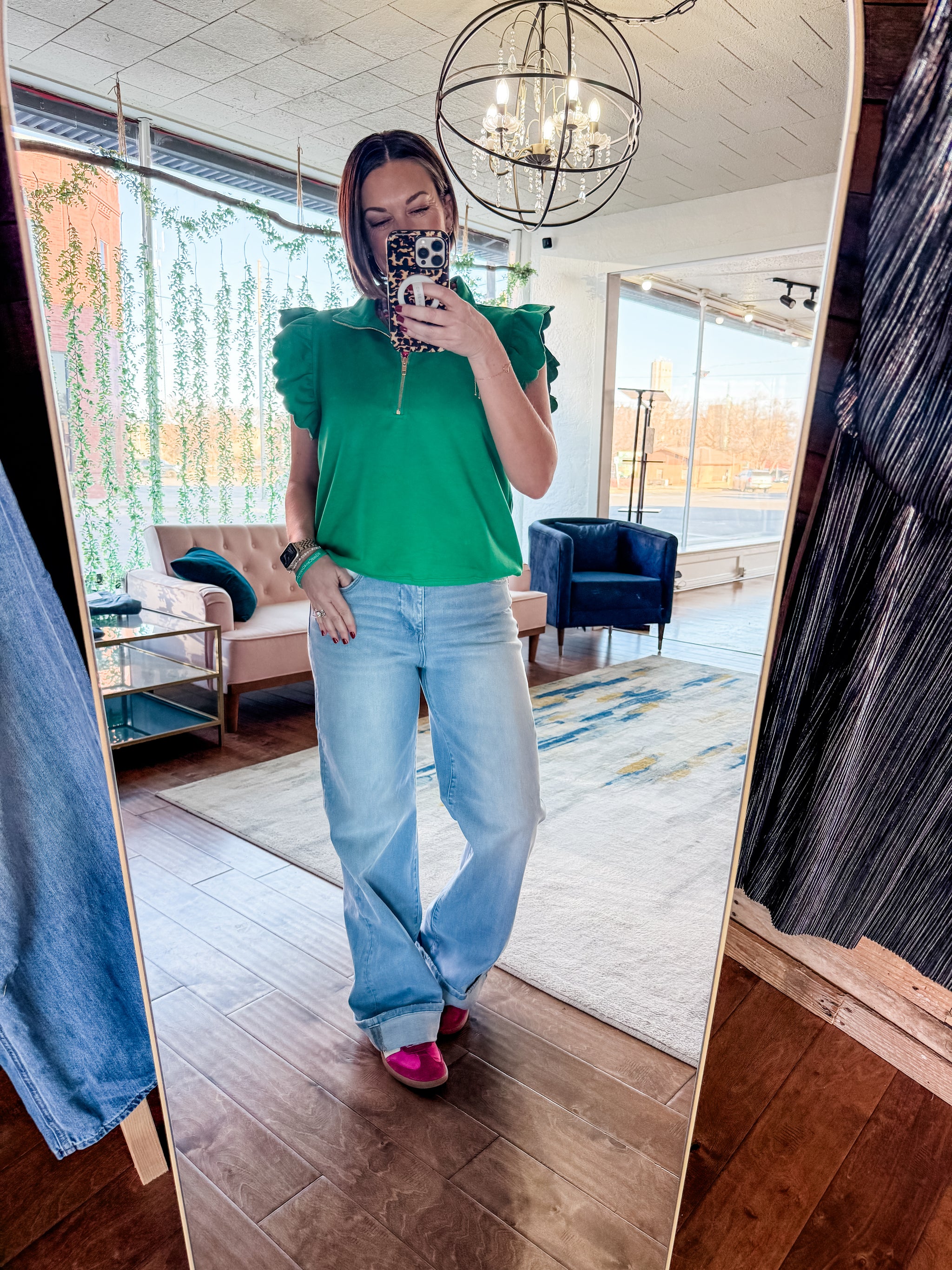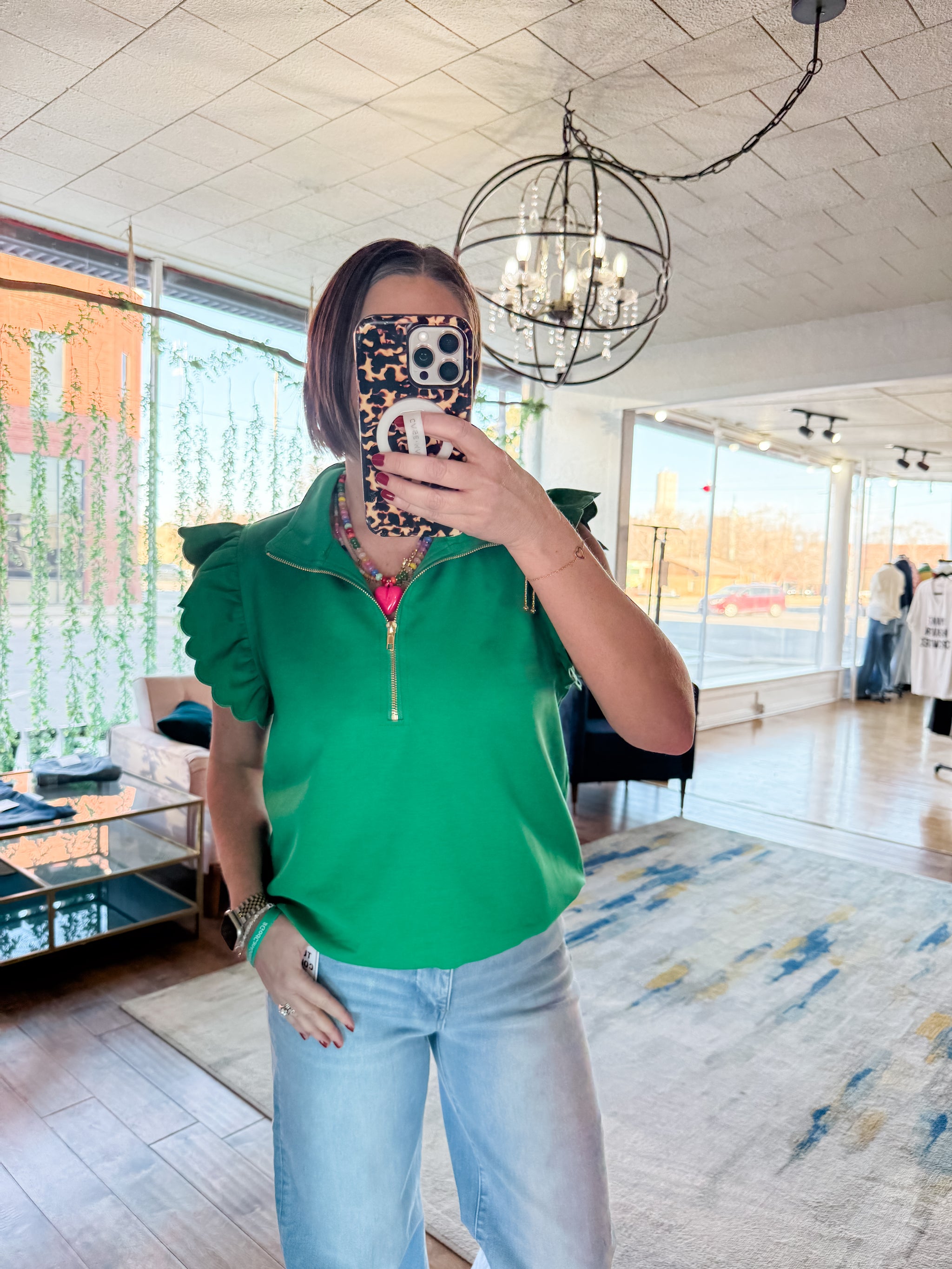 Elevate your casual wardrobe with this charming ruffled zip-up sweatshirt. Featuring delicate ruffled sleeves and a convenient half-zip neckline, it's perfect for layering or wearing solo. The relaxed fit with ribbed hem creates a flattering silhouette, while the soft, cozy fabric keeps you comfortable all day long.