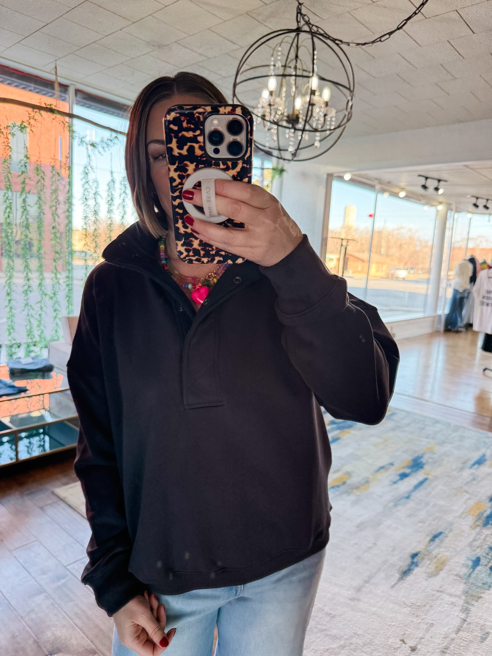 Elevate your casual wardrobe with this versatile snap collar pullover sweatshirt. Featuring a classic mock neck with convenient snap buttons for easy layering, this piece combines comfort with style. Long sleeves are finished with ribbed cuffs for a secure, tailored fit, while the ribbed bottom hem keeps everything in place throughout the day. Perfect for layering or wearing solo, this sweatshirt transitions seamlessly from weekend relaxation to everyday wear.